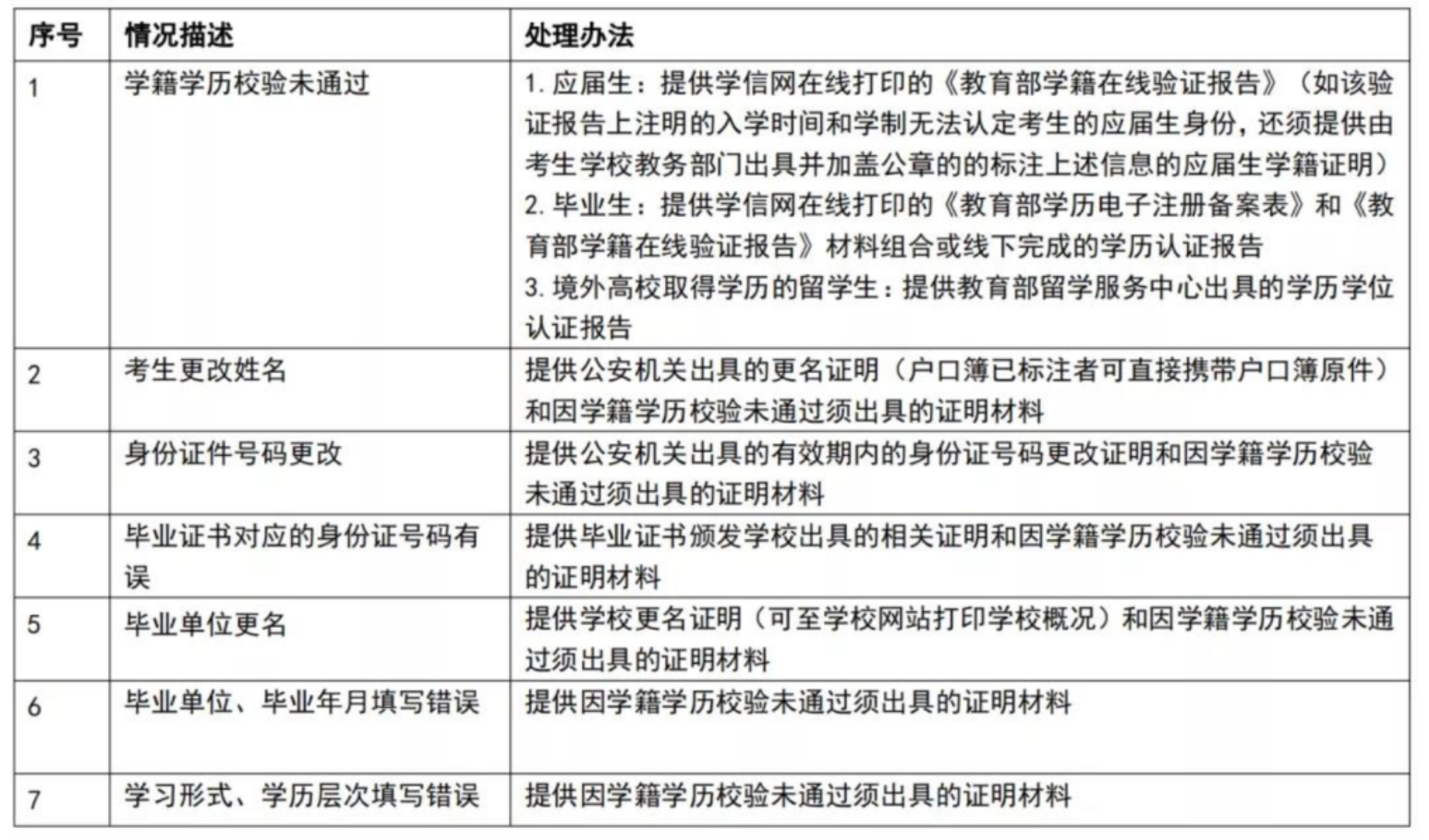 经教育部对考生报名信息校验,考生如出现以下情况,请按处理办法准备相关证明材料进行网上确认。